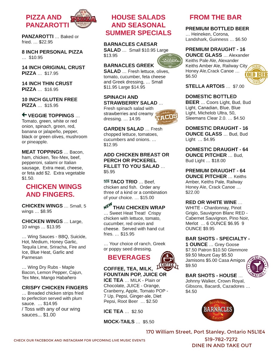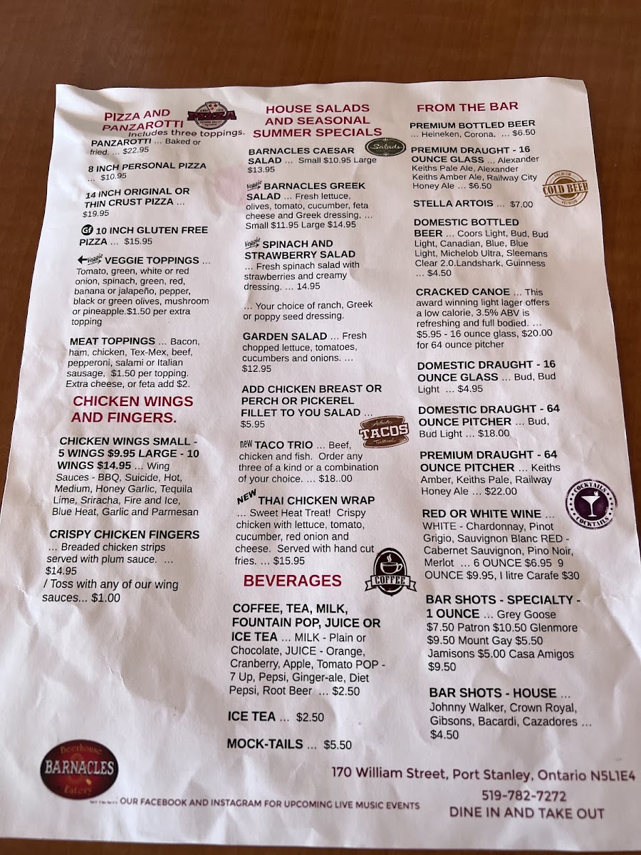 Welcome to The Barnacles Beerhouse, nestled in the heart of Port Stanley, Ontario. This lively bar and grill offers a delightful menu that will satisfy any appetite. Renowned for its mouth-watering panzerotti, each bite evokes a sense of homemade goodness that elevates it above the average pub fare. Customers rave about the fresh fish, expertly battered for a satisfying crunch, and the customizable gluten-free pizza featuring an array of toppings.